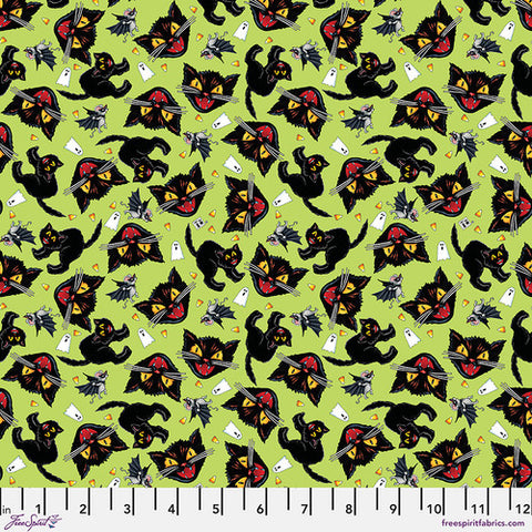 Free Spirit Spooky Cute Halloween PWMY004 Lime Cat & Mouse By The Yard