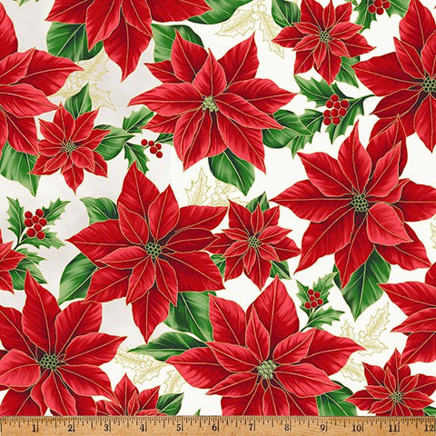 Hoffman Metallic - Blooming Holidays X7787 20G Natural/Gold Large Poinsettia By The Yard