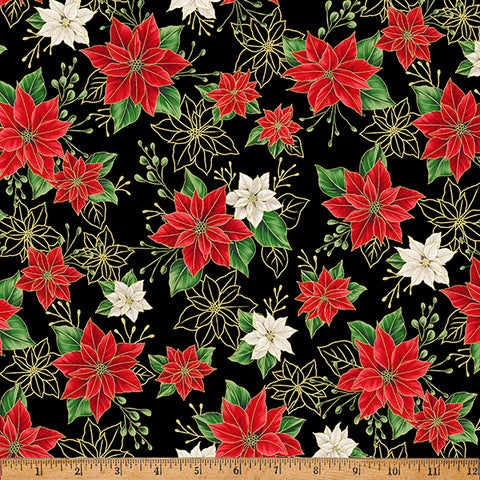 Hoffman Metallic - Blooming Holidays X7787 4G Black/Gold Large Poinsettia By The Yard