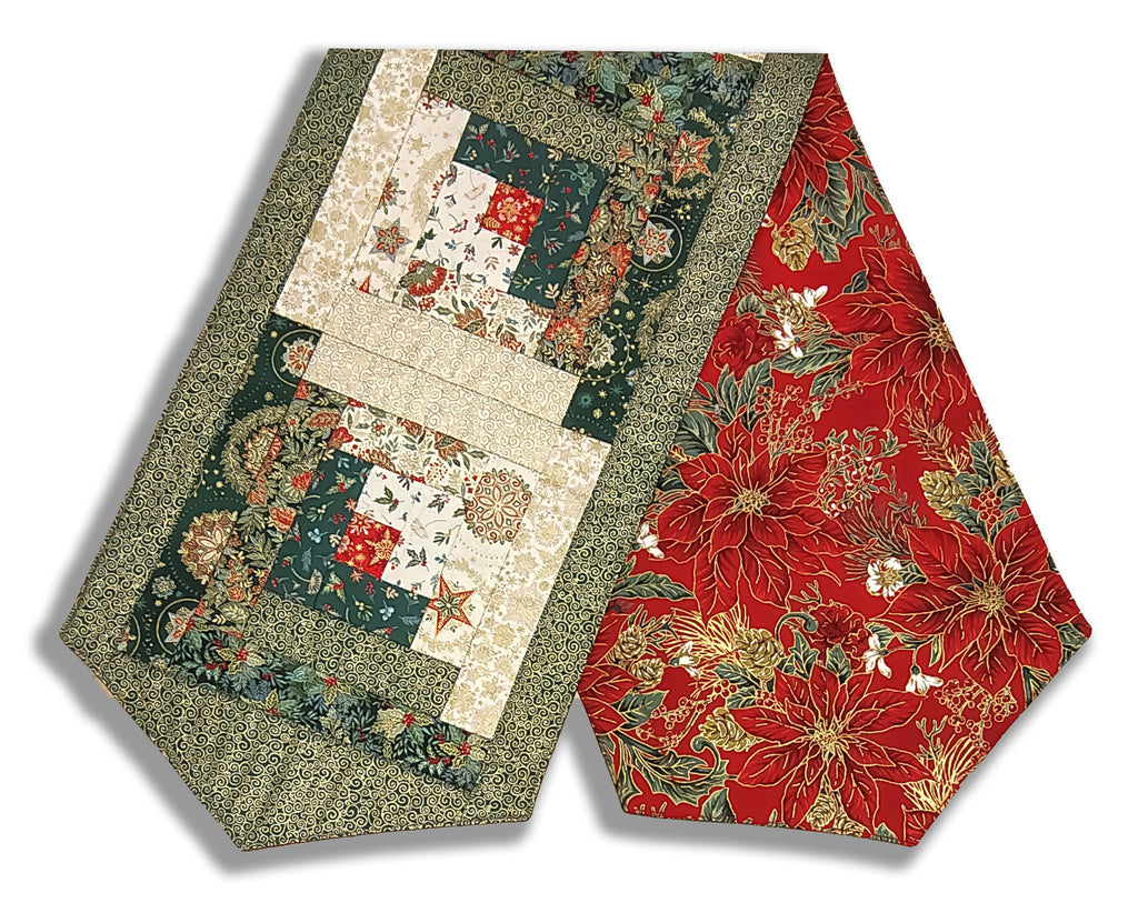 - This table runner is reversible with a log cabin patchwork on one side and a single printed fabric on the other.