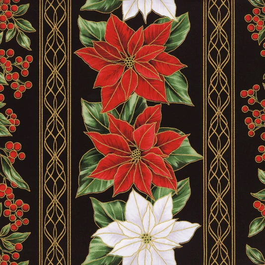Hoffman Metallic - Blooming Holidays X7789 4G Black/Gold Poinsettia Stripe By The Yard